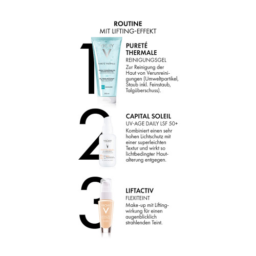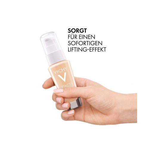 Das Anti-Falten-Make-Up mit straffender Silikon-Textur sorgt für einen sofortigen Lifting-Effekt und einen strahlenden Teint – ohne unerwünschten Masken-Effekt. Dank ihrer elastischen Eigenschaften mildert die straffende Silikon-Textur Falten und passt sich der natürlichen Mimik Ihres Gesichts an. Unebenheiten werden geglättet, der Teint wirkt ebenmäßig und strahlend – den ganzen Tag. Die mit Collagyl angereicherte Pflegeformel enthält drei hocheffiziente Anti-Falten-Wirkstoffe von Vichy. Es wirkt allen Ursachen vorzeitiger Hautalterung entgegen und hilft, Falten schon nach einem Monat zu mildern.
