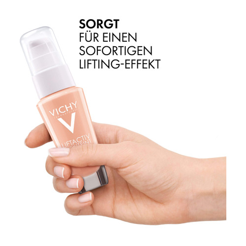 Das Anti-Falten-Make-Up mit straffender Silikon-Textur sorgt für einen sofortigen Lifting-Effekt und einen strahlenden Teint – ohne unerwünschten Masken-Effekt. Dank ihrer elastischen Eigenschaften mildert die straffende Silikon-Textur Falten und passt sich der natürlichen Mimik Ihres Gesichts an. Unebenheiten werden geglättet, der Teint wirkt ebenmäßig und strahlend – den ganzen Tag. Die mit Collagyl angereicherte Pflegeformel enthält drei hocheffiziente Anti-Falten-Wirkstoffe von Vichy. Es wirkt allen Ursachen vorzeitiger Hautalterung entgegen und hilft, Falten schon nach einem Monat zu mildern.