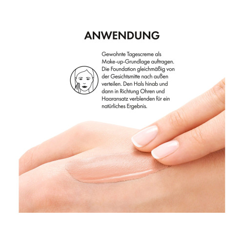 Nach dem Auftragen der gewohnten Tagespflege als Grundlage das Make-up mit den Fingerspitzen und sanft glättenden Bewegungen von der Gesichtsmitte nach aussen hin verteilen. Verstreichen Sie sorgfältig die Ränder an Hals, Ohren und Haaransatz, damit das Ergebnis perfekt natürlich wirkt.