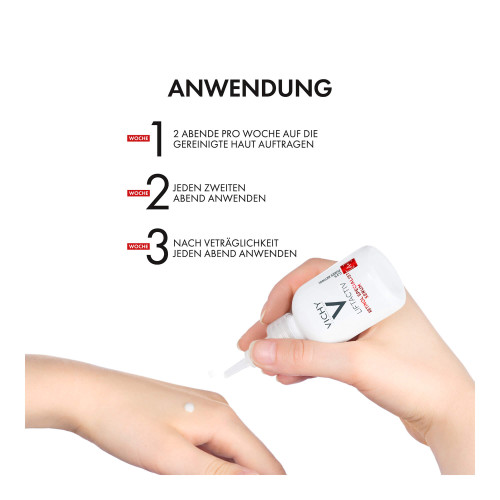 Das Anti-Aging Serum von Vichy entfaltet seine Wirkung am besten über Nacht. Da es sich um ein Aktiv-Produkt handelt, können anfängliche Rötungen und Spannungsgefühle auftreten. Tragen Sie in der ersten Woche 2-3 Tropfen des Retinol Serums an zwei Abenden in der Woche auf. In der zweiten Woche an jedem zweiten Abend anwenden. Bei guter Verträglichkeit ab der dritten Woche jeden Abend einige Tropfen des Serums auf die Haut geben.