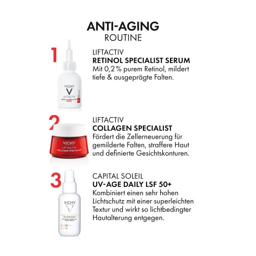 Für eine wirksame Anti-Aging Routine empfiehlt sich die LIFTACTIV Collagen Specialist Nachtcreme und für den Tag die CAPITAL SOLEIL UV-Age Daily LSF 50+ Tagescreme mit Sonnenschutz. Direkte Sonneneinstrahlung sollte vermieden werden.