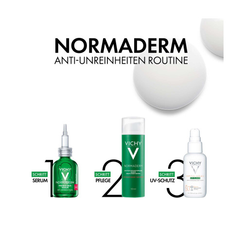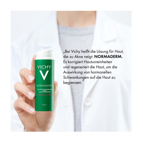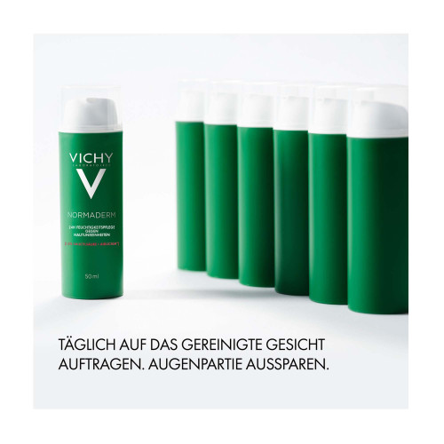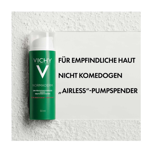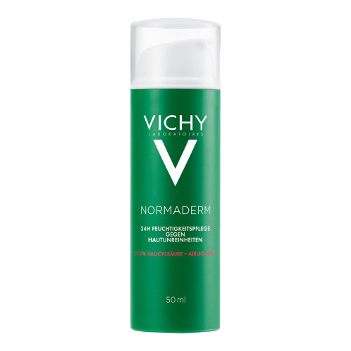 Vichy Normaderm Verschönernde Feuchtigkeitspflege gegen Hautunreinheiten Die mattierende Vichy Normaderm Gesichtspflege für unreine Haut versorgt fettige, zu Akne neigende Haut für bis zu 24 Stunden mit intensiver Feuchtigkeit. Zudem wirken hochwirksame Aktivstoffe, wie Air Licium und Phe-Resorcinol, vergrößerten Poren, Mitessern und Pickelmalen entgegen. Gesichtspflege für trockene, unreine Haut und Pickel Bereits ab der ersten Anwendung hinterlässt die Feuchtigkeitspflege für fettige Haut ein sichtbar verfeinertes und mattiertes Hautbild. Die dermatologisch getestete Formel ist nicht komedogen und enthält beruhigendes Vulkanwasser aus Vichy – auch für empfindliche Haut geeignet.