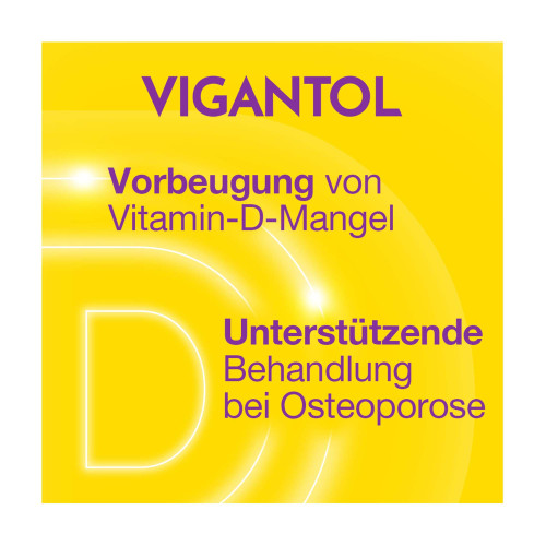 VIGANTOL®1000 I.E. Vitamin D3 Tabletten. Wirkstoff: Colecalciferol. Anwendungsgebiete: Zur Vorbeugung gegen Rachitis (Verkalkungsstörungen des Skeletts im Wachstumsalter, auch bei Frühgeborenen) und Osteomalazie (Knochenerweichung bei Erwachsenen). Zur Vorbeugung bei erkennbarem Risiko einer Vitamin-D-Mangelerkrankung bei ansonsten Gesunden ohne Resorptionsstörung (Störung der Aufnahme von Vitamin D im Darm) bei Kindern und Erwachsenen. Zur unterstützenden Behandlung der Osteoporose (Abbau des Knochengewebes) bei Erwachsenen. Warnhinweise: Enthält Sucrose (Zucker).