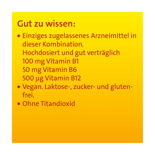 Wirkstoffe: Thiaminnitrat 100 mg / Pyridoxinhydrochlorid 50 mg / Cyanocobalamin 0,5 mg