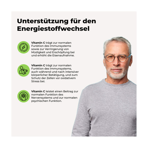 Es leistet einen Beitrag zur normalen Funktion des Nervensystems und zur normalen psychischen Funktion. Es unterstützt den Energiestoffwechsel, verringert Müdigkeit und Ermüdung und erhöht die Eisenaufnahme. Es trägt zu einer normalen Kollagenbildung für eine normale Funktion der Knorpel und Knochen, der Zähne und des Zahnfleisches sowie der Haut bei.