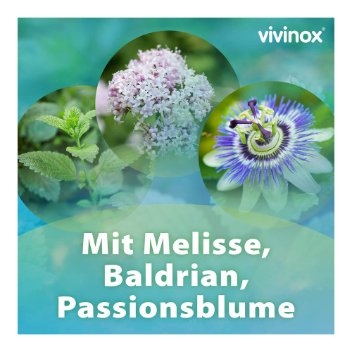 Vivinox® Nervenruhe Beruhigungsdragees Baldrian + Melisse + Passionsblume. Anwendungsgebiete: Bei Unruhezuständen und nervös bedingten Einschlafstörungen. Warnhinweise: Arzneimittel für Kinder unzugänglich aufbewahren. Enthält u.a. Glucose und Sucrose (Zucker).