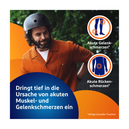 Zur lokalen, symptomatischen Behandlung von Schmerzen bei akuten Prellungen, Zerrungen oder Verstauchungen infolge eines stumpfen Traumas, z.B. Sport- und Unfallverletzungen.