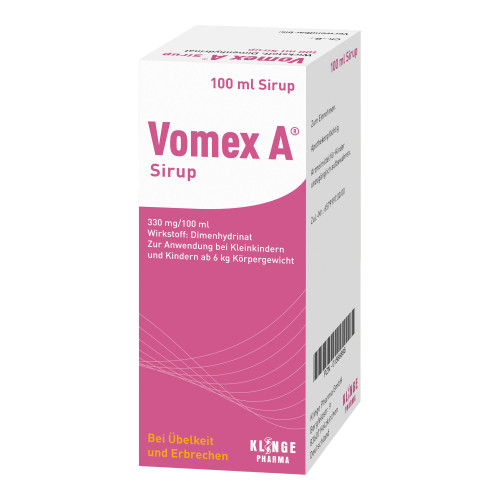 Vomex A® Sirup 330 mg/100 ml. Wirkstoff: Dimenhydrinat. Anwendungsgebiete: Zur Vorbeugung und Behandlung von Übelkeit und Erbrechen unterschiedlichen Ursprungs, insbesondere bei Reisekrankheit. Für Kleinkinder und Kinder ab 6 kg Körpergewicht. Warnhinweise: Enthält Sucrose (Zucker). Arzneimittel für Kinder unzugänglich aufbewahren.