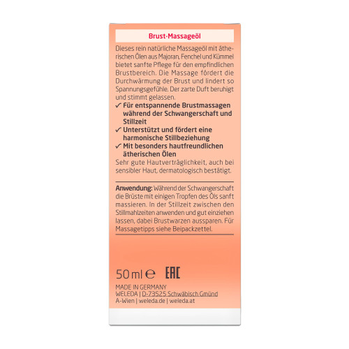 Die Hormone bereiten den Körper einer werdenden Mutter darauf vor, das Baby nach der Geburt mit der optimalen Nahrung zu versorgen: Muttermilch. Bereits während der Schwangerschaft und auch nach der Geburt beim Stillen kann es in der Brust zu Spannungsgefühlen kommen. Das Weleda Brust-Massageöl ist eine milde, zu 100% natürliche Mischung auf Basis von sanftem, Mandelöl. Eine regelmäßige Massage fördert die Durchblutung und Durchwärmung der Brust, und löst so Verspannungen in der Brust. Die Formel aus ätherischen Ölen in dem Weleda Brust-Massageöl wurde speziell auf Ihre Bedürfnisse abgestimmt. Der würzige Duft von Majoran, aromatische Komponenten von Lavendel und die Süße des Fenchelöls und haben gleichzeitig eine beruhigende und entspannende Wirkung. Die entspannende Massage mit Weleda Brust-Massageöl unterstützt eine harmonische Stillbeziehung mit Ihrem Baby.