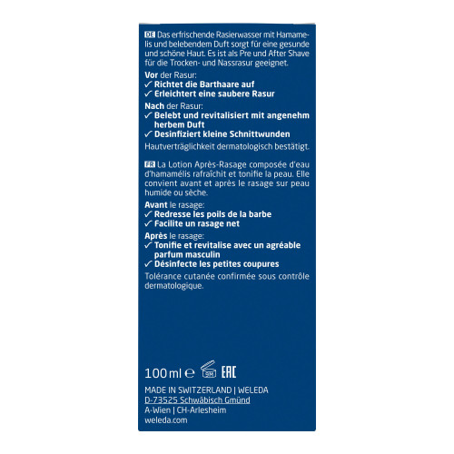 Das Weleda Rasierwasser ist als Pre- und After-Shave für die Trocken- und Nassrasur geeignet. Vor dem Rasieren angewendet, richten sich die Barthaare auf, was eine saubere Rasur erleichtert. Nach dem Rasieren erfrischt und belebt Weleda Rasierwasser die Haut. Es duftet angenehm herb und desinfiziert kleine Schnittwunden. Ein Auszug aus Myrrhe wirkt adstringierend und Hamamelis tonisiert die Haut.