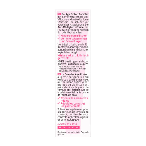 Die seidige Augenpflege stärkt die Barriere der zarten Haut um deine Augen und glättet die Haut sichtbar. Die Anti-Müdigkeits-Formel mit revitalisierendem Koffein lässt die Haut strahlen. Bio-Wildrosenöl und der Extrakt aus antioxidativem Weißem Tee bilden den Age-Protect-Complex, der wirksam vor ersten Anzeigen der Hautalterung schützt.