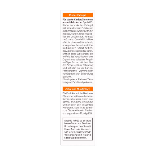Das Weleda Kinder-Zahngel ist in Geschmack und Konsistenz der kindlichen Wahrnehmung angepasst und erleichtert so die tägliche Zahnpflege für Kinder und Eltern. Sie enthält keine Fluoride. Die milde Gesamtkomposition enthält keine Substanzen, die den Organismus belasten, wenn das Gel geschluckt wird. Die pflanzlichen Auszüge des Zahngels und der bewährte Kieselsäure-Putzkörper entfernen Zahnbelag und schützen so zuverlässig vor Karies.