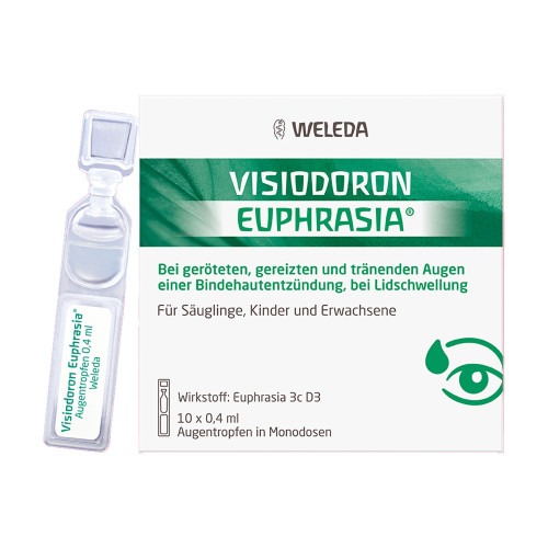 Visiodoron Euphrasia Augentropfen. Anwendungsgebiete: Gemäß der anthroposophischen Menschen- und Naturerkenntnis. Dazu gehören: Katarrhalische Entzündungen am Auge, die mit vermehrter Tränenabsonderung einhergehen; Lidödeme, vor allem auf allergischer Grundlage.