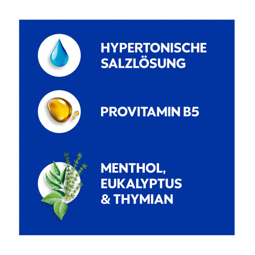 Wasser* (93,86%), Natriumchlorid* (3.05%), Dexpanthenol (Provitamin B5), PEG-40 hydriertes Rizinusöl, Kaliumphosphat, Dikaliumphosphat, ätherisches Eukalyptusöl*, Menthol*, ätherisches Thymianöl*, lsobornylacetat Bornylacetat.