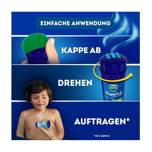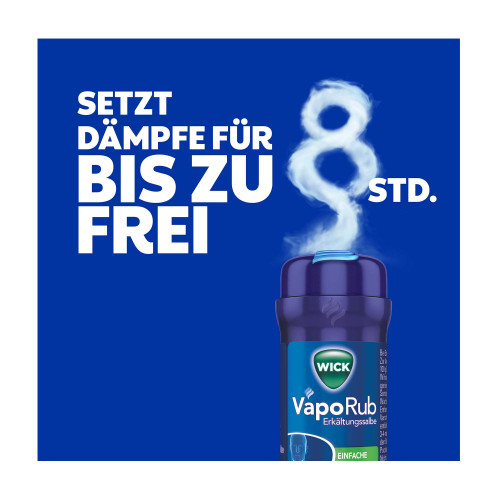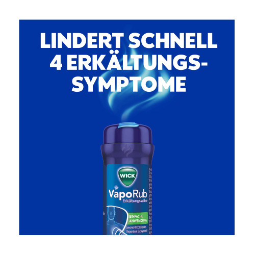 Wick VapoRub Erkältungssalbe. Anwendungsgebiete: Zur Besserung des Befindens bei Erkältungsbeschwerden der Atemwege (Schnupfen, Heiserkeit, Entzündung der Bronchialschleimhaut mit Symptomen wie Husten und Verschleimung).