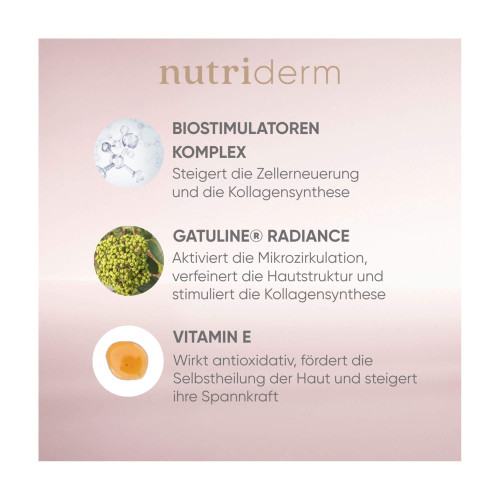Als wirksame Ergänzung der Tagespflege kann vor der nutriderm Tagescreme UV 50 Éclat Rosé das proderm Serum Extrait Liposomal (PZN 18442224) als Basis-Tiefenkonzentrat sowie das proderm Gel (PZN 19337825) oder die Creme für die Augenpartie (PZN 19337802) angewendet werden.
