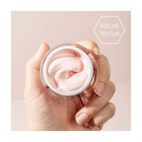 Die nutriderm Tagescreme UV 50 Éclat Rosé wird morgens nach der gründlichen Reinigung der Haut aufgetragen. Augenpartie aussparen.
