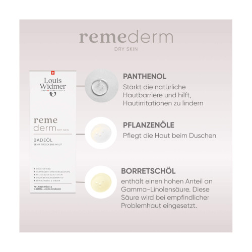 • Das remederm Ölbad ist ein emulgierender Badezusatz. Die Öle werden im Badewasser homogen verteilt. Die hochwertigen Fettstoffe werden der Haut somit über das Badewasser angeboten.