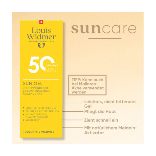Sonnenschutzprodukte sollten in ausreichender Menge aufgetragen werden, nur so wird die optimale Schutzwirkung erreicht: 1 Fingerlänge für das Gesicht, 2 Fingerlängen für einzelne Körperzonen. Sun Gel 50 ca. 30 Minuten vor der Sonnenexposition auftragen. Nach längerem Aufenthalt im Wasser oder Sand empfiehlt sich eine erneute Anwendung. Die maximale Aufenthaltsdauer in der Sonne (hängt vom Hauttyp ab), kann durch das wiederholte Auftragen des Sonnenschutzproduktes nicht verlängert werden.